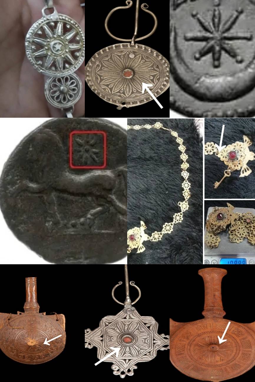 #أوراس_الحضارة ...مثال عن استمرارية استخدام رمز بتلة الخصوبة الثمانية منذ ماقبل الميلاد الى غاية اليوم بصفة عفوية على الحلي الشاوي ،علب بودرة البارود... تقابلها فسيفساء محلية من مواقع في باتنة ، عملة نوميدية للاقليد ماسنسن ، عملة للحقبة البيزنتية .. حلي شاوي قديم معروض في متاحف عالمية وآخر من مكتبة صور فرنسية ...!